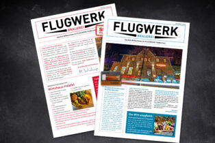 Mit bis zu 400 Sitzplätzen in der Gaststätte, im Stüberl sowie im Biergarten zählt das FLUGWERK mit eigener Hausbrauerei zu den herausragenden Gastrobetrieben im Umfeld Münchens. Die Speisenkarte mit Sommer- und Winterausgabe ist dabei mehr als nur das Angebot von Speisen und Getränken. Mit interessanten Textbeiträgen, dem Küchen-Tipp und der Vorstellung des Merchandise-Angebots ist die Speisenkarte ein bewusstes Marketinginstrument.